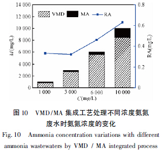 由圖10 可知,在VMD 操作條件為: pH = 10.5,T料液= 40℃,v料液= 0.10 m/s,p =-90 kPa,MA 操作條件為: pH = 10.5,T料液= 20℃,T硫酸= 20℃;v料液= 0.10 m/s,v硫酸= 0.10 m/s,H2SO4 0.02 mol /L。不同初始濃度的氨氮廢水在經(jīng)過預(yù)處理之后進(jìn)入VMD/MA 集成膜處理工藝,先由VMD 工藝分別脫除84. 85%、90. 46%、92. 98% 和84. 43% 的氨氮,接著進(jìn)入MA 工藝脫除剩余氨氮的99. 78%、99. 89%、99.89%和99. 96%,這樣經(jīng)過VMD 和MA2 個工藝之后廢水中殘留的氨氮濃度(RA) 就是圖中折線所示,分別為0. 33、0. 32、0. 46 和0. 63 mg /L。根據(jù)《污水綜合排放標(biāo)準(zhǔn)-GB8978-1996》,第二類污染物比較高允許排放濃度,醫(yī)藥原料、染料、石油化工工業(yè)氨氮排放量一級標(biāo)準(zhǔn)≤15 mg /L、二級標(biāo)準(zhǔn)≤50mg /L; 其他排污單位氨氮排放量一級標(biāo)準(zhǔn)≤15 mg /L、二級標(biāo)準(zhǔn)≤25 mg /L。出水符合污水綜合排放標(biāo)準(zhǔn)一級標(biāo)準(zhǔn)。具體參見http://www.dowater.com更多相關(guān)技術(shù)文檔。