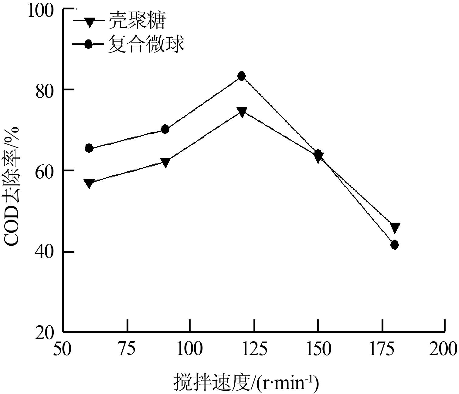 在pH為8,復(fù)合微球投加量為6 mg/L(對比實(shí)驗(yàn)殼聚糖投加量為8 mg/L),沉降時(shí)間為24 h的條件下,考察了攪拌速度對處理效果的影響,結(jié)果如圖 3所示。