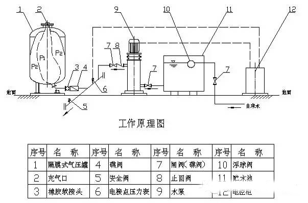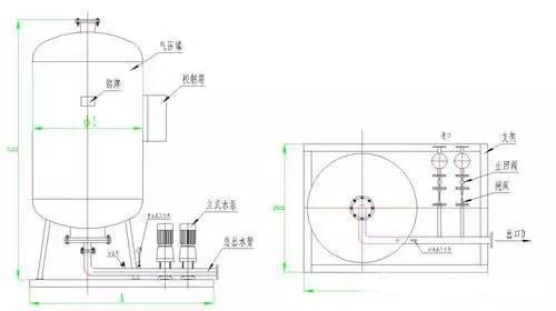 系統(tǒng)中定壓點壓力確定:定壓點壓力的高低要考慮兩個因素,一個是系統(tǒng)運行時任一點都不超壓,二是系統(tǒng)停運時系統(tǒng)不倒空。如果定壓點的壓力過高,系統(tǒng)中的每一點的壓力也就相應(yīng)的增高,導(dǎo)致管道、閥門或設(shè)備等在高壓下運行,出現(xiàn)強度破壞或疲勞損壞。壓力設(shè)置太低,系統(tǒng)就會倒空出現(xiàn)氣堵,而導(dǎo)致介質(zhì)循環(huán)不暢。氣壓罐工作壓力值按以下方法確定(推薦) (1)補水泵啟動壓力P1: P1=Po+0.005;“Po”系統(tǒng)最高點壓力 (2)補水泵停泵壓力P2: