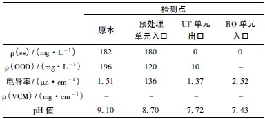 本設(shè)計(jì)進(jìn)水量為65 m3 /h,產(chǎn)水量為48 m3 /h,濃縮液量為17 m3 /h,回收率≤75%。實(shí)際操作進(jìn)水量為48 m3 /h,產(chǎn)水量為36 m3 /h,濃縮液量為12 m3 /h,一段進(jìn)液壓力控制在1. 8 MPa 以下,每支壓力容器壓降≤0. 4 MPa。原水經(jīng)反滲透膜過(guò)濾后,鹽和相對(duì)質(zhì)量超過(guò)100 的有機(jī)物被除去,使產(chǎn)水水質(zhì)達(dá)到要求。