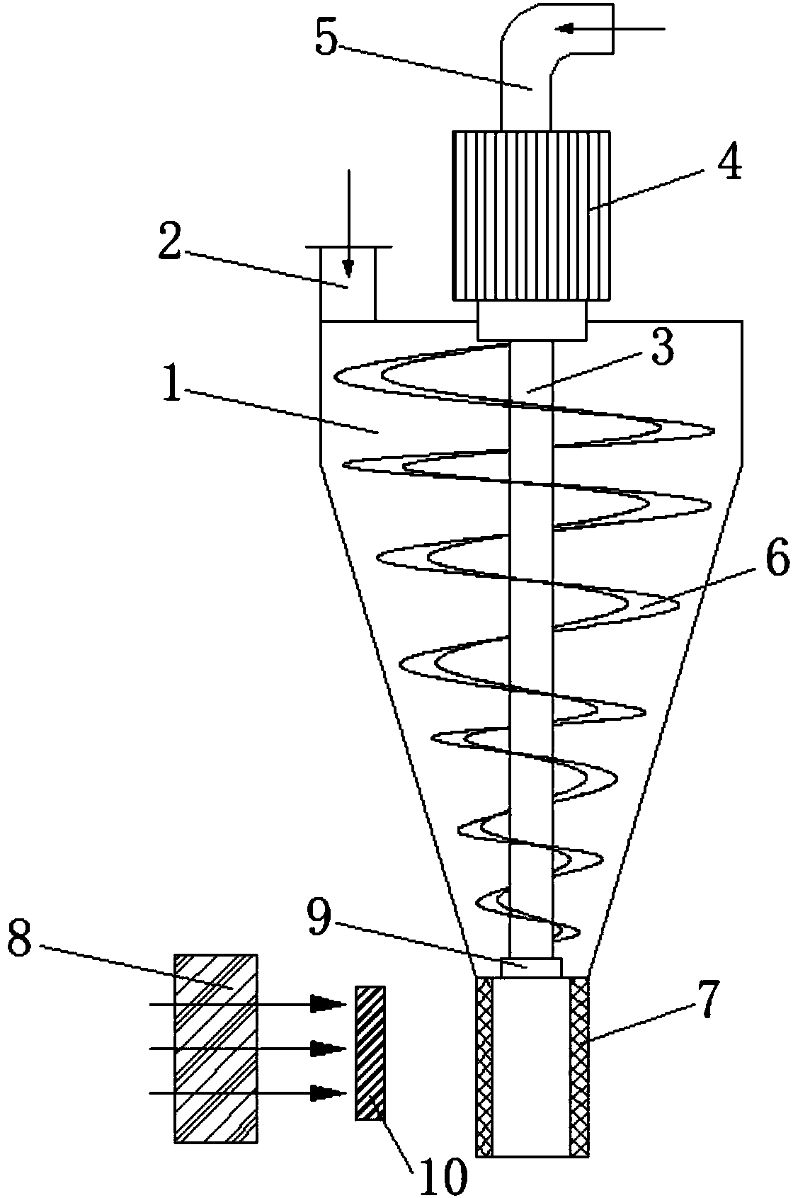 為實(shí)現(xiàn)上述目的,本發(fā)明提供如下技術(shù)方案:一種高效率化學(xué)廢水廢渣處理設(shè)備,包括反應(yīng)腔體,所述反應(yīng)腔體整體呈筒狀,且下部分筒體的內(nèi)徑長度逐漸減小,所述反應(yīng)腔體的頂部一側(cè)開設(shè)有進(jìn)料口,所述反應(yīng)腔體的內(nèi)部中間位置還豎向裝設(shè)有轉(zhuǎn)動(dòng)軸,所述轉(zhuǎn)動(dòng)軸的頂端與外部的轉(zhuǎn)動(dòng)電機(jī)的轉(zhuǎn)子同軸連接,且轉(zhuǎn)動(dòng)電機(jī)的轉(zhuǎn)子與轉(zhuǎn)動(dòng)軸均為中空設(shè)計(jì),且相通連接,所述轉(zhuǎn)動(dòng)電機(jī)的轉(zhuǎn)子外部開設(shè)有除臭凈化液添加口,所述轉(zhuǎn)動(dòng)軸的外部周向螺旋安裝有攪拌葉片,所述反應(yīng)腔體的底部出料口外部裝設(shè)有脫水管道,所述脫水管道的側(cè)壁為網(wǎng)狀,所述脫水管道的側(cè)面裝設(shè)有鼓風(fēng)電機(jī)。