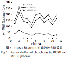 從圖4 和圖5 中可以看出,HUSB 對(duì)氨氮和磷具有一定的去除效果,平均去除率分別為18.9%和18.6%。而MBBR 對(duì)氨氮和磷去除效果,則平均分別為77.5%和72.1%。具體參見http://www.dowater.com更多相關(guān)技術(shù)文檔。