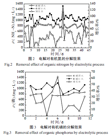 電解過程對(duì)廢水可生化性的提高作用,還表現(xiàn)在廢水中氨氮和無機(jī)磷濃度的增加,如圖2 和圖3所示,電解過程對(duì)有機(jī)氮的分解效果可使出水氨氮濃度水平平均增長(zhǎng)率達(dá)34.7%。對(duì)有機(jī)磷的分解效果則可使出水磷酸鹽磷濃度水平平均增長(zhǎng)率達(dá)26.7%,可見電解過程起到了部分分解有機(jī)物,降低了有機(jī)物濃度水平,同時(shí)電解后的混合液,氨氮和無機(jī)磷的濃度水平都有了一定幅度的提高,將使電解出水中C:N:P 的比例更適于生物降解,也即增加了廢水的可生化性。