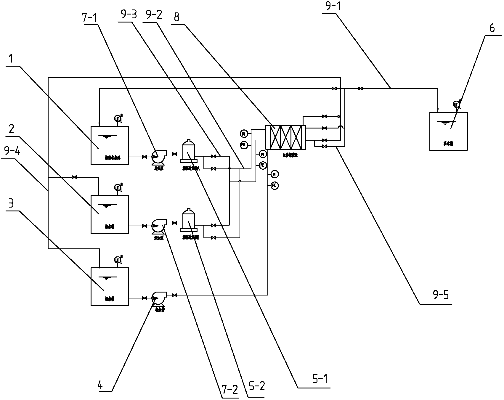 1.一種電滲析法回用高鹽廢水裝置,包括高鹽水水池(1),其特征在于,高鹽水水池(1)通過管路(9-1)連接淡水箱(6),高鹽水水池(1)通過管路連接精密過濾器A(5-1),精密過濾器A(5-1)通過第三管路(9-3)連接精密過濾器B(5-2),精密過濾器B(5-2)通過管路連接濃水箱(2);精密過濾器A(5-1)通過第二管路(9-2)連接電滲析裝置(8),電滲析裝置(8)通過管路連通到第三管路(9-3),電滲析裝置(8)通過管路連接極水箱(3),極水箱(3)通過第四管路(9-4)連接電滲析裝置(8),濃水箱(2)通過管路連通第四管路(9-4)。