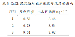 以CaCl2作為化學(xué)沉淀劑,出水中氟離子濃度小于4mg·L-1,遠小于排放標準中要求的10mg·L-1,也小于氟化鈣的溶解度8.9mg·L-1,且效果穩(wěn)定。這是因為當(dāng)水中含有氯化鈣、硫酸鈣等可溶性的鈣鹽時,由于同離子效應(yīng)而降低氟化鈣的溶解度,使出水中氟離子濃度大大降低。