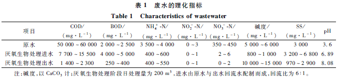 廢水來自某集團纖維素乙醇中試基地的生產(chǎn)廢水,以玉米秸稈為原料,采用稀酸蒸汽爆破預(yù)處理、水洗過濾、酶解、C6單獨發(fā)酵工藝得到乙醇,發(fā)酵液經(jīng)蒸餾提取乙醇后的塔釜醒液稱之為纖維素乙醇廢水。纖維素乙醇廢水水質(zhì)可見表1,在對該廢水進行脫氮處理之前需通過厭氧生化處理,降低廢水中有機物、色度對硝化階段的影響,本實驗用水就是經(jīng)過厭氧生物處理后的廢水。由于纖維素乙醇廢水水質(zhì)波動大,經(jīng)厭氧生化處理的出水水質(zhì)也有較大變化,其主要水質(zhì)理化指標(biāo)見表1。