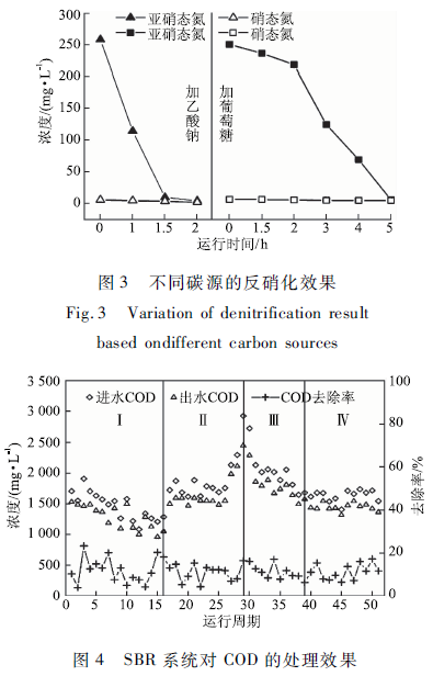 實驗中根據(jù)硝化階段產(chǎn)生的亞硝酸鹽氮質(zhì)量濃度確定外加碳源的投加量,并保證投加碳源充足。葡萄糖和乙酸鈉均可作為反硝化反應(yīng)的碳源,卻表現(xiàn)出不同的反硝化效率。以乙酸鈉作為碳源(C/N = 5 : 1)時,由于碳源充足,NO2- -N在1.5 -2 h內(nèi)幾乎全部去除,反硝化率高達98. 11%;而以葡萄糖為碳源(C/N=7:1)時,出水3h后,NO2- -N從250降至 125. 53 mg / L ,反硝化率僅為51. 49%,延長反硝化時I司至Sh,出水NO2- -N降至6. 42 mg / L ,反硝化率達到97. 86%,可以明顯看出以乙酸鈉為外加碳源比葡萄糖可以更快地消耗亞硝態(tài)氮,所以以乙酸鈉作為碳源反硝化速率更快(見圖3)。經(jīng)分子結(jié)構(gòu)分析,乙酸鈉是小分子有機物,易于生物降解,作為外加碳源時反硝化效率有更高。葡萄糖是大分子有機物,須先分解為小分子才能被微生物利用,可生化性不如乙酸鈉。