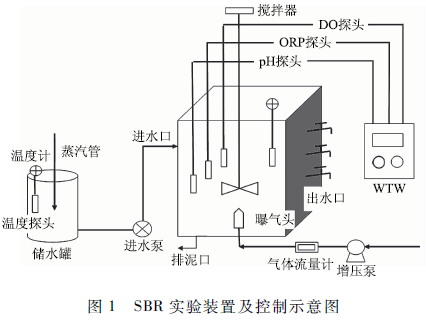 實驗裝置為不銹鋼材質(zhì)的長方反應(yīng)器,長1 250 mm,寬800 mm,高1 500 mm,四壁設(shè)有保溫夾層,其中正面設(shè)有3個采樣日,反應(yīng)器有效容積1 000 L,總?cè)莘e1 500 L。反應(yīng)器內(nèi)配有可提升管式微孔曝氣器,采用鼓風(fēng)曝氣,并通過轉(zhuǎn)子流量計調(diào)節(jié)曝氣量。在SBR的頂部設(shè)置有精密加力電動攪拌機,在反硝化階段啟動,使泥水完成混合并加快反硝化反應(yīng)的進程。在反應(yīng)器底部設(shè)有2個排泥口,必要時通過排泥口排泥。