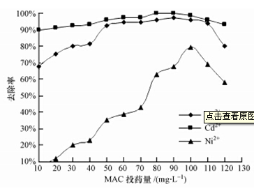 ·MAC 對(duì)含Cu2+、Cd2+ 、Ni2+的廢水均能達(dá)到較好的處理效果,投加量少,生成絮體時(shí)間短,沉降性好,易于固液分離,出水水質(zhì)好,出水pH值在6.0~8.0之間;