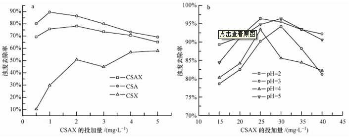 圖 4 CSAX 的除濁性能(a.與CSX、CSA的對(duì)比;b.不同pH值下的性能)