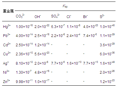 表 1 重金屬難溶化合物的溶度積常數(shù)(Ksp)