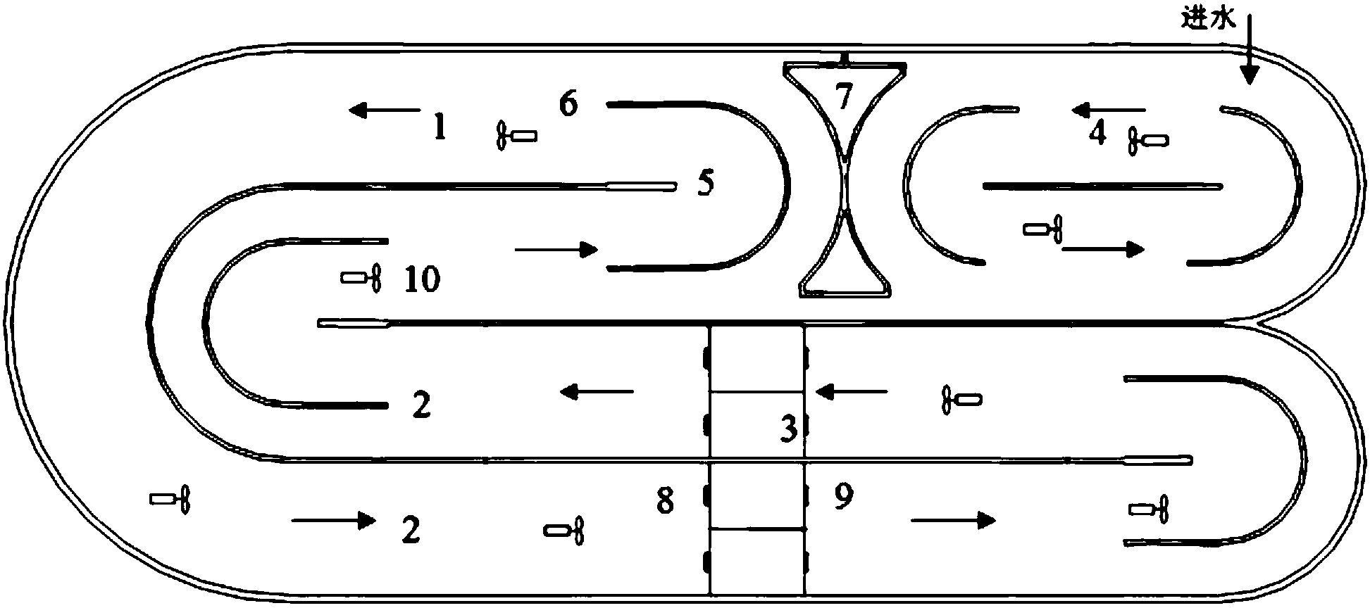 以脫氮為主要處理目標,氧化溝-MBR反應器內(nèi)分為缺氧/好氧區(qū);以同時脫氮除磷為主要處理目標,分為厭氧/缺氧/好氧區(qū)。按不同工段的工藝要求,進行攪拌、曝氣。各個工段之間相互連接,池型結(jié)構(gòu)和水力設計保證氧化溝內(nèi)同時實現(xiàn)完全混合式和推流式,水流在整個池體內(nèi)不斷循環(huán),瞬時混合。