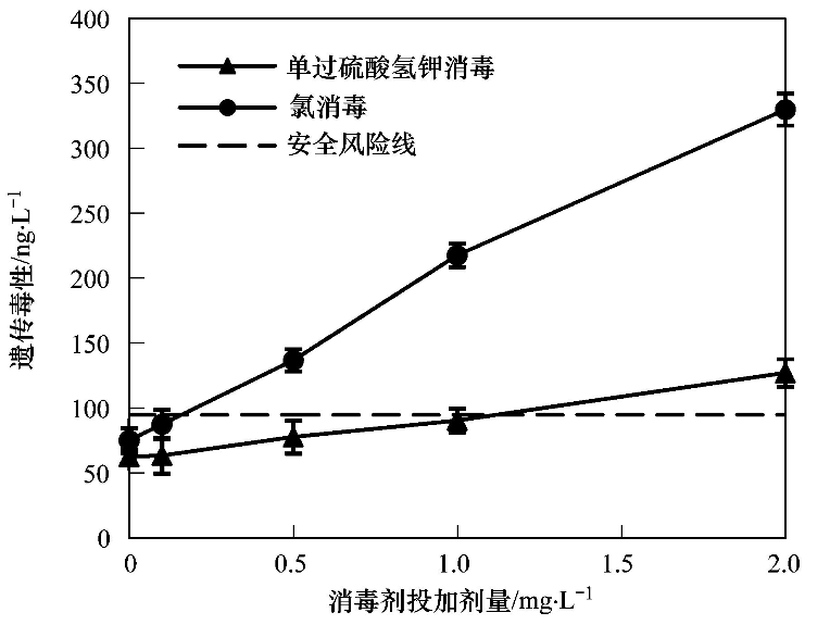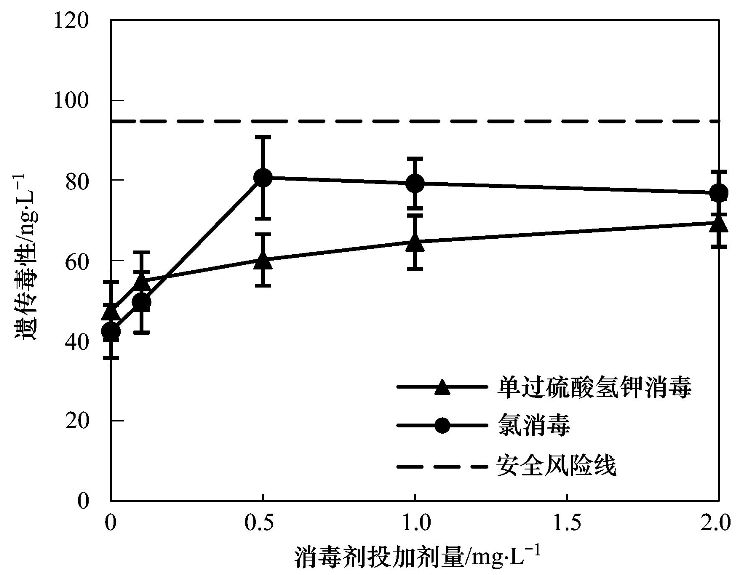 原水在氯的投加量達到0.5 mg·L-1時,遺傳毒性當(dāng)量濃度為137.0 ng·L-1,已高于安全風(fēng)險閾值(94.8 ng·L-1),隨著氯投加量的增大,遺傳毒性呈較為快速增長的趨勢. 原水中投加氯消毒后的遺傳毒性明顯高于單過硫酸氫鉀復(fù)合粉消毒,并且明顯高于安全風(fēng)險閾值. 但在單過硫酸氫鉀復(fù)合粉投加量達到2.0 mg·L-1時,遺傳毒性當(dāng)量濃度為127.1 ng·L-1,超過了安全閾值,說明當(dāng)水樣有機物較多時,提高單過硫酸氫鉀復(fù)合粉的投加量也存在著一定安全風(fēng)險.