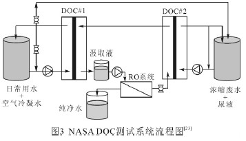 空間站和星際旅行都需要對水進(jìn)行處理和循環(huán)利用。太空任務(wù)中可回收的水源有日常用水,尿液和空氣水分。美國宇航局(NASA)聯(lián)合Osmotek 公司開發(fā)了直接滲透濃縮系統(tǒng),即DOC 系統(tǒng)用于太空任務(wù)中的水處理和循環(huán)利用[22-23]。比較初的DOC 測試系統(tǒng)處理流程如圖3 所示,包括一個(gè)反滲透處理系統(tǒng)和2 個(gè)DOC 預(yù)處理子系統(tǒng),一個(gè)是正滲透過程、另一個(gè)是正滲透與膜蒸餾結(jié)合過程(用于分離尿素和尿酸類物質(zhì)),采用氯化鈉驅(qū)動溶液將廢水濃縮后,利用反滲透從稀釋的汲取液中分離得到純凈水。