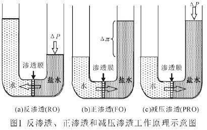 Lee 等(1981)[1]較早地概況總結(jié)了反滲透(RO)、正滲透(FO)和減壓滲透((Pressure Retarded Osmosis,PRO)過程的工作原理,如圖1 所示。在RO 過程中,水在外加壓力作用下從低化學(xué)勢側(cè)通過滲透膜擴(kuò)散至高化學(xué)勢側(cè)溶液中( Δπ<ΔP),達(dá)到脫鹽目的。正滲透過程剛好相反,水在滲透壓作用下從化學(xué)勢高的一側(cè)自發(fā)擴(kuò)散到化學(xué)勢低的一側(cè)溶液。而減壓滲透可認(rèn)為是反滲透和正滲透的中間過程,水壓作用于滲透壓梯度的反方向,水的凈通量仍然是向濃縮液方向。這三個(gè)過程可以用下式來描述:Jw=A(σΔπ-ΔP);式中Jw—水通量;A—膜的水滲透性常數(shù);σ—反擴(kuò)散系數(shù);Δπ—膜兩側(cè)的滲透壓差;ΔP—膜兩側(cè)的壓力差。