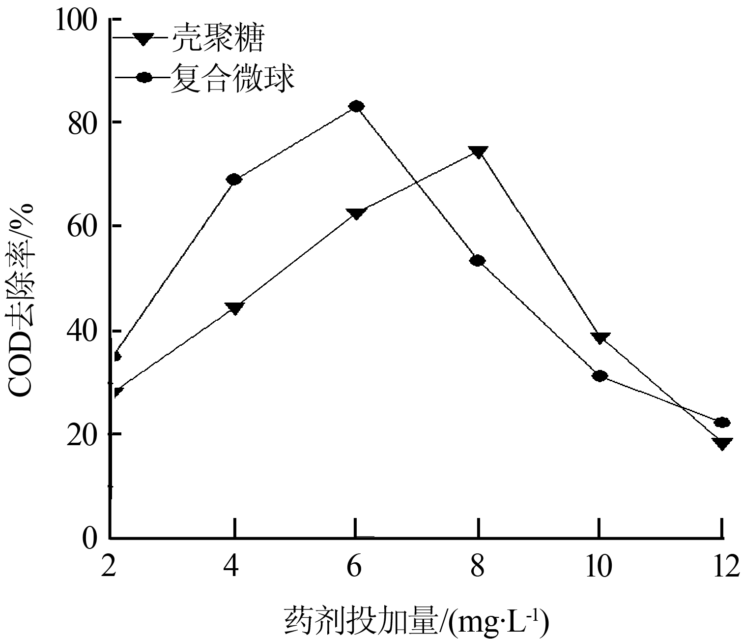 取50 mL造紙廢水于200 mL燒杯中,投加一定量的復(fù)合微球,攪拌反應(yīng)3 min。沉降,取上清液,采用標(biāo)準(zhǔn)K2Cr2O7法測定化學(xué)需氧量。同時(shí),以殼聚糖作為絮凝劑進(jìn)行平行實(shí)驗(yàn)。