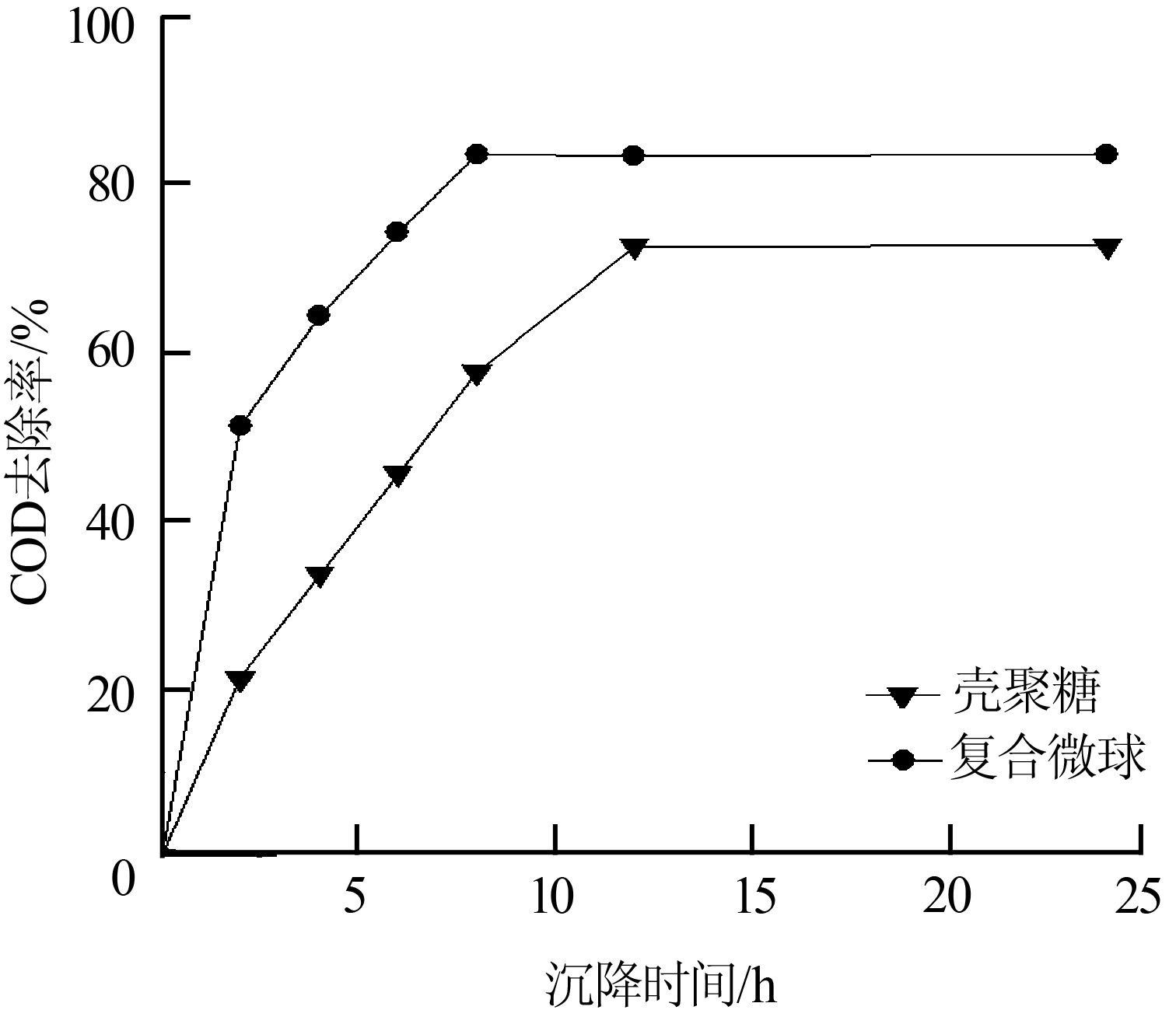 在pH為8,攪拌速度為120 r/min,復(fù)合微球投加量為6 mg/L(對比實(shí)驗(yàn)殼聚糖投加量為8 mg/L)的條件下,考察了沉降時(shí)間對處理效果的影響,結(jié)果如圖 4所示。