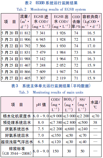 該工藝穩(wěn)定成熟、運(yùn)行可靠、管理方便,經(jīng)過調(diào)試,系統(tǒng)運(yùn)行效果良好,各項(xiàng)水質(zhì)達(dá)到標(biāo)準(zhǔn)要求。EGSB 運(yùn)行數(shù)據(jù)見表2,各主體單元平均運(yùn)行結(jié)果見表3。