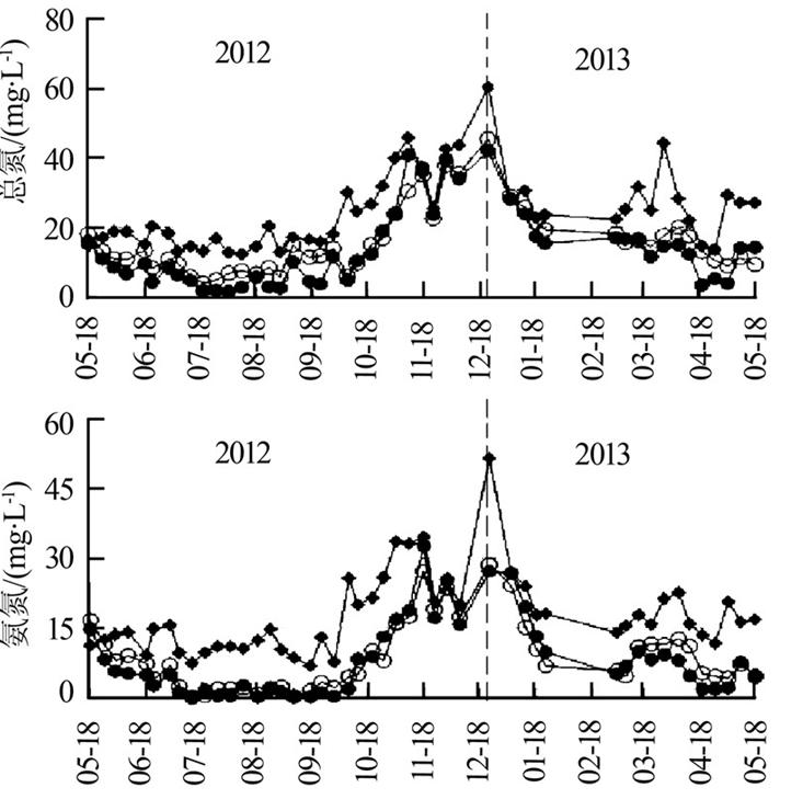 實驗從2012年5月18日至2013年5月18日為期1 a。為了研究植物和基質級配對營養(yǎng)物去除效果的影響,在距離濕地進水口水平方向的1/4、2/4和3/4處分別采集深度為7.5、25、45 cm(各種級配基質的中間層)的水樣。濕地進出水水樣每周取一次,DO采用HQ30d便攜式溶解氧測定儀(美國哈希公司)測定,TN、NH3-N、NO3--N、NO2--N、TP、PO43--P、COD、BOD5和SS按照《水和廢水監(jiān)測分析方法》〔8〕測定。濕地植物于2012年5月26日基本長出,于2012年10月5日收割,生長期為132 d。收割時保留植物根部及基質以上10 cm的莖稈。植物樣品的氮磷含量采用H2SO4-H2O2消解法測定〔9〕。
