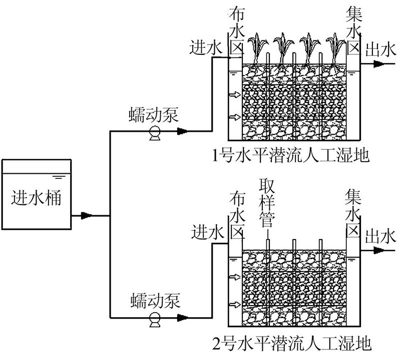 于西安建筑科技大學校內構建2組結構相同的由有機玻璃構成的水平潛流人工濕地(尺寸均為0.75 m×0.4 m×0.8 m)。為了獲得較好的水力性能和處理效果,實驗采用了不同粒徑的填料組成,其礫石粒徑配比從下到上為15 cm大粒徑(d:15~30 mm)、25 cm小粒徑(d:5~15 mm)、15 cm大粒徑(d:15~30 mm),基質孔隙率為50%。1號濕地為種植蘆葦?shù)乃綕摿鳚竦,種植密度為13株/m2,2號濕地為未種植植物的空白水平潛流濕地。礫石、蘆葦均取自西安皂河附近。