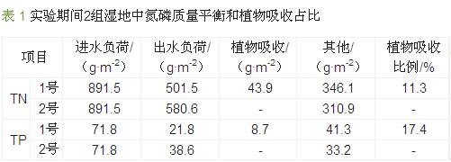 秋季對1號濕地中的植物進行收割,通過測量植物干重和植物內的氮磷含量,得到實驗期間通過植物吸收所去除的營養(yǎng)物總量,并與2號濕地進行對比,結果如表 1所示。