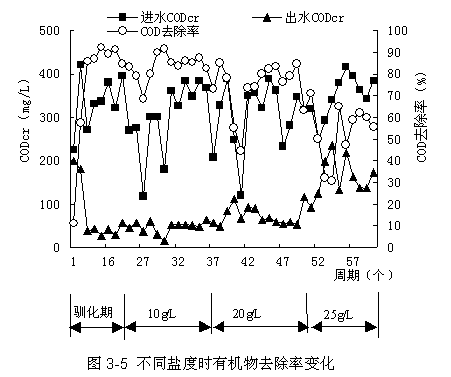 耐鹽微生物:能耐受一定濃度的鹽溶液,但在無鹽條件下生長比較好,其生長也不需要大量無機鹽。 ![]() ![]() 此圖為部分適鹽微生物形態(tài)的電鏡圖 4 生物處理高鹽污水遇到的問題 鹽度適應(yīng)差 傳統(tǒng)活性污泥法馴化處理鹽度低于2%含鹽廢水。 當(dāng)鹽度環(huán)境變?yōu)榈h(huán)境時,污泥的適應(yīng)性會很快消失。 鹽度變化影響大 鹽度在0.5~2%變化通常會對處理系統(tǒng)產(chǎn)生嚴重的干擾。 突然變化鹽度比逐漸變化鹽度對系統(tǒng)的干擾更大 從高鹽變?yōu)闊o鹽產(chǎn)生影響比低鹽環(huán)境變?yōu)楦啕}環(huán)境產(chǎn)生的影響要大 降解速率緩慢 隨著鹽度的升高有機物降解速率下降,因此低F/M更適合含鹽廢水的處理。圖3.5為SBR法處理在各鹽度下的處理效果。 污泥流失嚴重 鹽度改變污泥中微生物的組成,改變了污泥的沉淀性和出水SS,污泥流失嚴重.