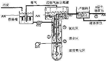 、谝坏┻@個(gè)循環(huán)建立并穩(wěn)定后,空氣注入點(diǎn)轉(zhuǎn)移到混合區(qū)的下部。未處理的污泥通過入流管在混合區(qū)空氣注入點(diǎn)的同等高度進(jìn)入液體循環(huán)。 、蹓毫蜕疃葘(dǎo)致了高的氧氣傳導(dǎo)速率從而保證混合區(qū)內(nèi)的混合溶液中具有高的溶解氧量。氧化區(qū)內(nèi)高的反應(yīng)速率保證了有機(jī)物能在垂直循環(huán)圈的上部被生物氧化。 ④再循環(huán)液體沿著井筒的豎壁到達(dá)上部箱體中,在那里含有廢氣的氣泡可以將廢氣釋放入大氣中。去掉這些微生物呼吸作用產(chǎn)生的氣態(tài)產(chǎn)物,對(duì)于防止這些廢氣重新回到系統(tǒng)內(nèi)影響空氣動(dòng)力效率是非常必要的。 、莼旌弦后w中比例較小的一部分從混合區(qū)進(jìn)入下部第二級(jí)消化區(qū)。這個(gè)區(qū)域內(nèi)溶解氧含量極高,停留時(shí)間較長,所以,污泥中剩余的有機(jī)物在此被高度氧化。同時(shí)所含的溶氣也有利于后續(xù)產(chǎn)物池中的固液分離。此過程比較關(guān)鍵和比較重要的特點(diǎn)是在這個(gè)過程中隨著有機(jī)物的氧化,污泥溫度不斷升高,并利用周圍良好的保溫環(huán)境使反應(yīng)器的溫度得到穩(wěn)定。 、尴蟮奈勰嘁詷O快的速度到達(dá)地表的產(chǎn)物箱,這個(gè)速度可以保證砂粒和固體物質(zhì)不會(huì)沉積在井底。 、呋旌弦后w行至上表面過程中快速的減壓可以導(dǎo)致固體物質(zhì)從液體中分離并懸浮于表面。分離出來的高濃度生物具有【水處理設(shè)備】不同的用處。廢液循環(huán)至二級(jí)處理以便于達(dá)標(biāo)排放。