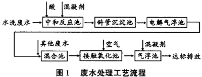 染料水洗廢水、鈷酞菁水洗廢水經管道收集直接自流入中和反應池,中和反應池上安裝混凝劑投加裝置及攪拌裝置,經調整pH值后,用泵將廢水打入斜管沉淀池,出水自流入電解氣浮池。
