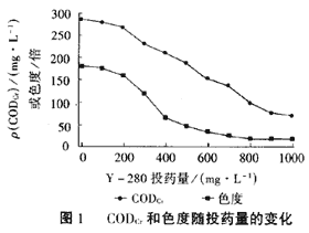 在設(shè)計(jì)的實(shí)驗(yàn)方法和條件下,固定水樣為1000mL,通過(guò)改變Y280的投加量得到不同澄清度的上清液,加藥量與上清液的CODcr、色度之間的關(guān)系見(jiàn)圖1和圖2。
