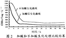 圖2是印染—堿減量混合污水少量加酸調(diào)pH值至10左右與不加酸直接生化處理的比較結(jié)果,結(jié)果表明:不加酸中和的混合污水在生化反應(yīng)上有一個滯后期,其后雖然CODCr去除速率與加酸中和污水的差不多,但污水處理比較終的殘余CODCr濃度卻比加酸中和污水的殘余CODCr濃度高出約100mg/L,這說明在污水中少量加酸中和有利于生化處理。