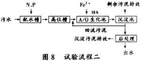 試驗(yàn)流程二見圖8。此試驗(yàn)是先進(jìn)行A/O生化處理,然后進(jìn)行混凝沉淀后處理的流程試驗(yàn)。