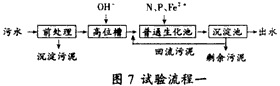 試驗(yàn)流程一見圖7。此試驗(yàn)是采用酸化—化學(xué)混凝處理,使污水CODCr濃度大大降低后,再進(jìn)行生化處理的流程試驗(yàn)。