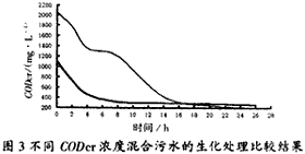 圖3是高CODCr濃度混合污水與較低CODCr濃度混合污水的生化處理比較試驗(yàn)結(jié)果。結(jié)果表明:采用好氧生化處理時,欲達(dá)到相同的處理出水水平,高濃度污水需處理較長時間。