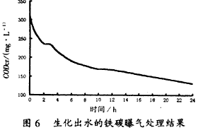 由于混合污水經(jīng)生化法處理后,CODCr濃度仍有300 mg/L左右,未能達(dá)標(biāo),因此作為把關(guān)措施之一的鐵碳曝氣處理是否有能力處理達(dá)標(biāo)就顯得比較關(guān)鍵,處理結(jié)果如圖6所示。