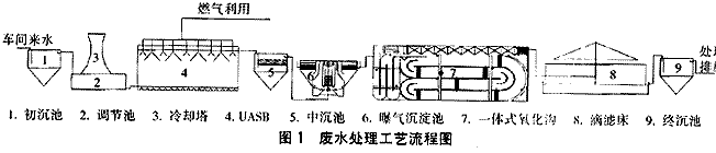 廢水首先通過(guò)預(yù)處理除去固體物質(zhì)、降低水溫、均化水質(zhì)。預(yù)處理構(gòu)筑物包括初沉池、調(diào)節(jié)池、冷卻塔,經(jīng)預(yù)處理后廢水水溫降至37 ℃左右,達(dá)到中溫厭氧發(fā)酵所需的要求,同時(shí)它還能保證處理系統(tǒng)運(yùn)行的穩(wěn)定性。
