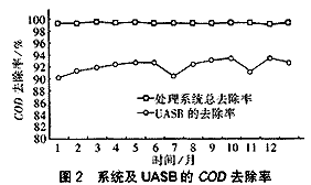 幾個(gè)月的運(yùn)行表明,整個(gè)廢水處理系統(tǒng)對(duì)COD的去除率較高(99%以上),同時(shí)具有較高的耐沖擊能力。