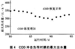 關(guān)于膜通量降低的原因可分析如下:COD沖擊負荷使反應(yīng)器內(nèi)活性污泥濃度迅速增加,微生物進入生命活動旺盛的對數(shù)增長期,細胞繁殖速度加快,MLSS迅速增大說明了這一點。污泥濃度的提高增加了混合液的粘度,從而使液—固分離困難;同時處于對數(shù)增長期的污泥活性 高、有大量細胞外聚合物存在[4],增加了膜過濾阻力,也是膜比較大出水量降低的原因。