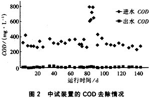 運行期間進水COD的平均值為366.4 mg/L,比較大值為780.9 mg/L,比較小值為228.0 mg/L。出水COD的平均值為13.1mg/L,比較大值為25.2mg/L,比較小值為4.4mg/L,COD的平均去除率為96.0%;沖擊負荷對出水COD去除沒有影響,這說明系統(tǒng)的穩(wěn)定性和可靠性。試驗結(jié)果如圖2所示。