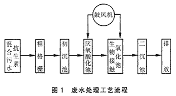 厭氧酸化--生物接觸氧化法反應(yīng)處理單元從接種、馴化到正常運行歷時2個月。接種污泥取自啤酒廠生物接觸氧化池。調(diào)試時,分別向厭氧酸化池和生物接觸氧化池投加一定量的接種污泥,之后通入COD為2000mg/L的生產(chǎn)廢水進(jìn)行悶曝,厭氧酸化池可間歇曝氣,生物接觸氧化池連續(xù)曝氣。4d后連續(xù)進(jìn)水,投配青霉素、麥白霉素、鏈霉素、螺旋霉素、大觀霉素等十多種生產(chǎn)廢水混合液,間斷調(diào)整進(jìn)水濃度、投配負(fù)荷、兩池的氣水比。45d時,填料掛膜基本完好,運行基本正常。當(dāng)厭氧酸化池的氣水比為5∶1,氧化池氣水比為45∶1時,厭氧酸化池的去除容積負(fù)荷可達(dá)4.93kgCOD/(m3·d),生物接觸氧化池的去除容積負(fù)荷為5.15kgCOD/(m3·d)以上。出水COD濃度可降至443 mg/L。兩池的處理效果見表1和表2。