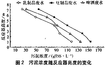厭氧反應器中的污泥顆;潭容^好,經2年運行后,從反應器各取樣管取樣測定污泥濃度的結果見圖2。
