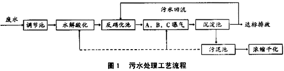 通過(guò)對(duì)生產(chǎn)裝置和廢水水質(zhì)調(diào)查,選用前置反硝化的生物脫氮工藝,處理工藝流程見(jiàn)圖1。