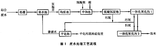 物化法和生化法聯(lián)合使用是處理印染廢水常規(guī)的典型工藝[1];炷恋砭哂忻撋腿コ龖腋∥锬芰(qiáng)的特點(diǎn),同時(shí)所投加的混凝劑也可以起到一定的調(diào)節(jié)pH作用。生化法對(duì)溶解性的有機(jī)物去除能力強(qiáng)。在本工程中,由于廢水中的主要污染物在pH為6~9條件下為難溶性的對(duì)苯二甲酸和各種分散染料等,因此綜合廢水先經(jīng)混凝沉淀,可有效地去除有機(jī)污染物、色度和調(diào)節(jié)pH值,并提高廢水的生化性能,為后續(xù)生化處理創(chuàng)造有利條件。生化法采用 氧化溝工藝,適用于該印染廢水水質(zhì)特點(diǎn)和對(duì)出水水質(zhì)高的要求。? 廢水處理工藝流程詳見圖1。