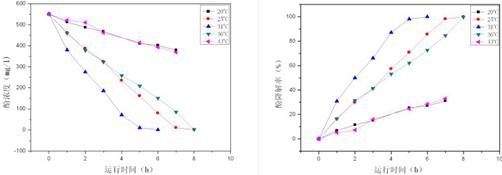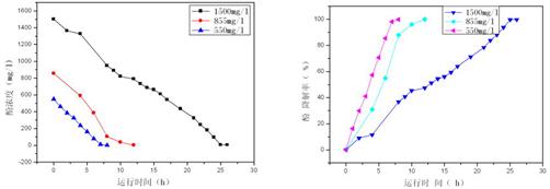 圖為相同的MLSS=3500mg•L-1,pH=7.2,T=25ºC,不同初始濃度下苯酚濃度與時(shí)間的關(guān)系圖,從圖中看出,酚初始濃度為550 mg•L-1時(shí),經(jīng)過(guò)8h時(shí),酚初始濃度為855 mg•L-1時(shí),經(jīng)過(guò)12h,酚初始濃度為1500 mg•L-1時(shí),苯酚經(jīng)過(guò)26h,苯酚降解完全,降解率達(dá)到99%以上。